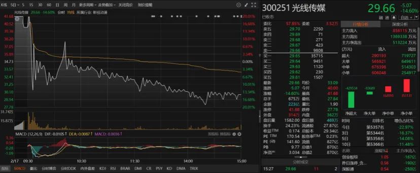 值得一提的是,今日影视概念板块跌近4%,光线传媒早盘上演“准天地板”,之后盘中震荡,最后收跌14.6%报29.66元/股。