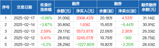 融资方面,当日融资买入1.37亿元,融资偿还1.17亿元,融资净买入2008.43万元,连续4日净买入累计2.71亿元。融券方面,融券卖出6.82万股,融券偿还2.29万股,融券余量20.18万股,融券余额1421.22万元。融资融券余额合计31.14亿元。