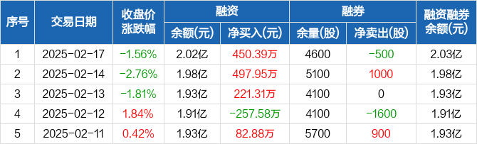 川恒股份融资融券信息显示,2025年2月17日融资净买入450.39万元;融资余额2.02亿元,较前一日增加2.28%。