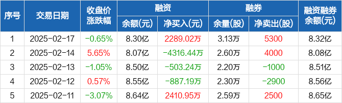 融资方面,当日融资买入1.42亿元,融资偿还1.19亿元,融资净买入2289.02万元。融券方面,融券卖出1.37万股,融券偿还8400股,融券余量3.13万股,融券余额173.34万元。融资融券余额合计8.32亿元。
