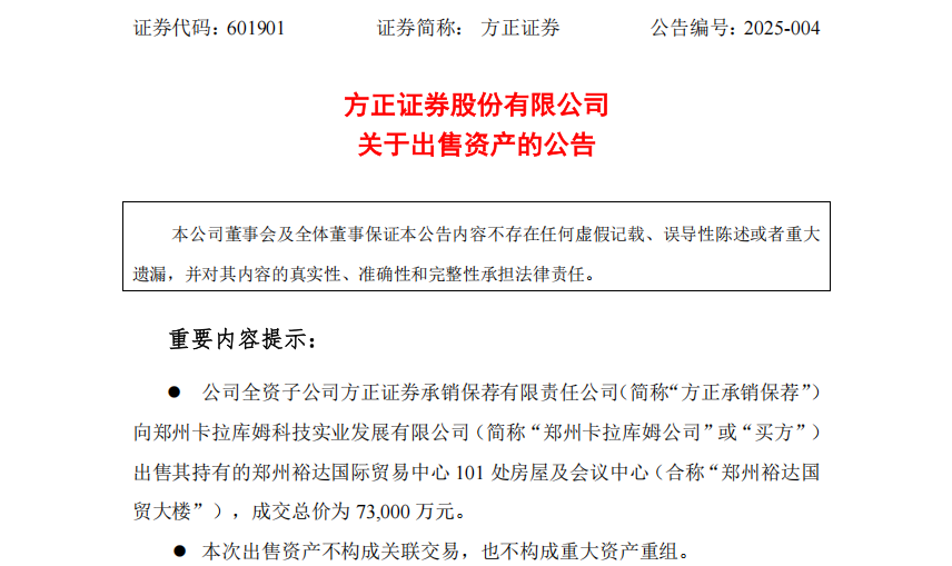 2月17日晚间,方正证券(601901)发布公告,其全资子公司方正证券承销保荐有限责任公司将持有的郑州裕达国际贸易中心101处房屋及会议中心,以7.3亿元的总价售予郑州卡拉库姆科技实业发展有限公司。该交易已于1月27日签署《房屋买卖合同》,并获方正证券第五届董事会第十一次会议审议通过,既不构成关联交易,也不属于重大资产重组。