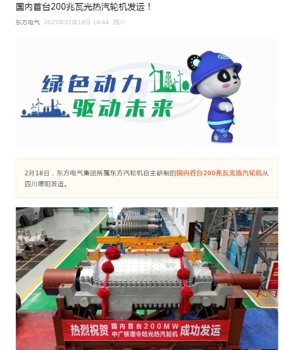 每经AI快讯,2月18日,东方电气集团所属东方汽轮机自主研制的国内首台200兆瓦光热汽轮机从四川德阳发运。该光热汽轮机将应用于国内单体规模最大塔式光热项目——中广核德令哈100万千瓦光热储一体化项目。该项目位于“中国光热之都”青海省德令哈市,海拔高达3000米,是国内储能配比率最高的光热储多能互补项目,采用熔盐塔式技术路线,由东方电气研制供货光热汽轮机、光热发电机、蒸汽发生系统,将实现大规模光伏、光热、储能协同发电技术的科技创新与工程示范验证。