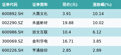 截至收盘,文化传媒主题涨跌幅最高的五只股票为:大晟文化(600892.SH)、禾盛新材(002290.SZ)、浙文互联(600986.SH)、金利华电(300069.SZ)与亨通股份(600226.SH)。详情见下表: