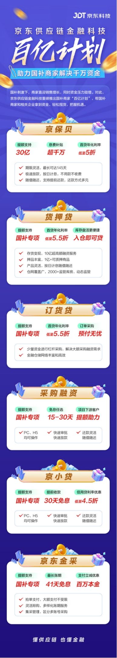 为满足商家资金需求、抓住国补销售机遇,京东供应链金融科技推出国补商家“百亿计划”——京保贝、货押贷、订货贷、采购融资、京小贷、京东金采等产品,为商家提供专项提额和息费补贴。