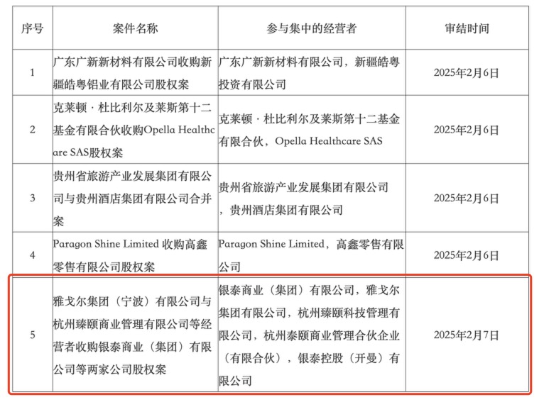 与此同时,Paragon Shine Limited 收购高鑫零售有限公司股权案也获批,银泰集团和高鑫零售都曾是阿里巴巴新零售版图的主力,分别于2024年12月和2025年1月被阿里巴巴出售。