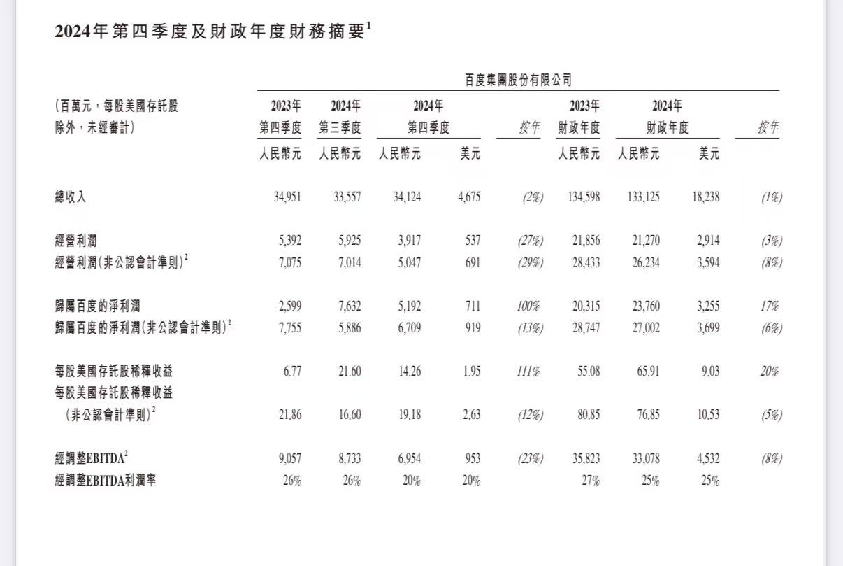 2月18日,百度公布2024年第四季度业绩及全年业绩。百度去年营收1331亿元,同比减少1%,归属于百度的净利润为238亿元,同比增长17%;非美国通用会计准则下百度的净利润为270亿元,同比减少6%。