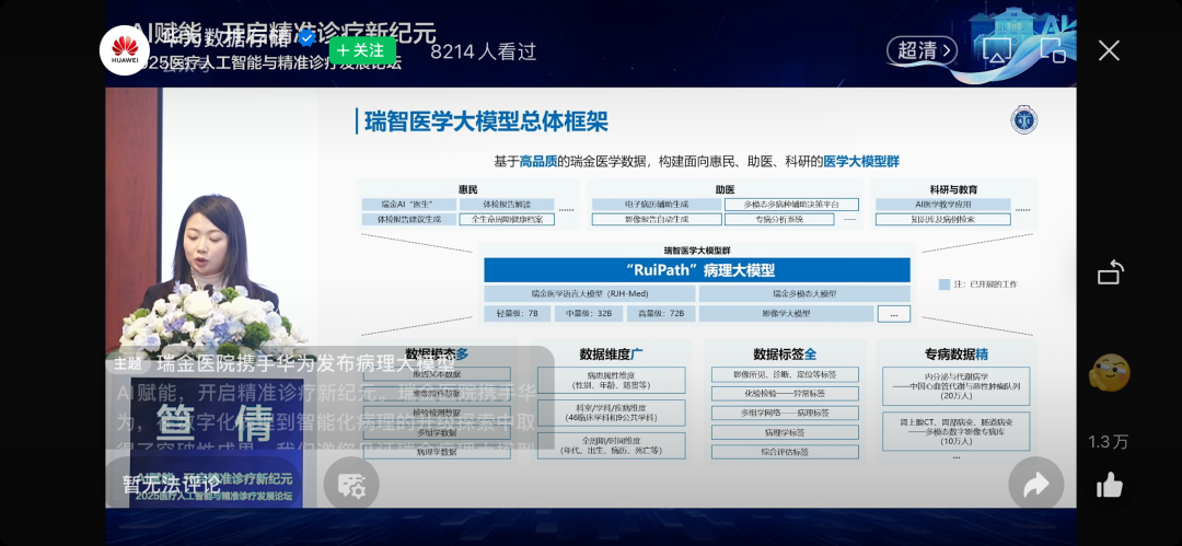 论坛上,瑞金医院发布了瑞智病理大模型RuiPath,该大模型基于华为DCS AI解决方案,是带领医疗行业从数字化病理升级到智能化病理的成果之一,将在病理诊断场景下加速医疗智慧化。
