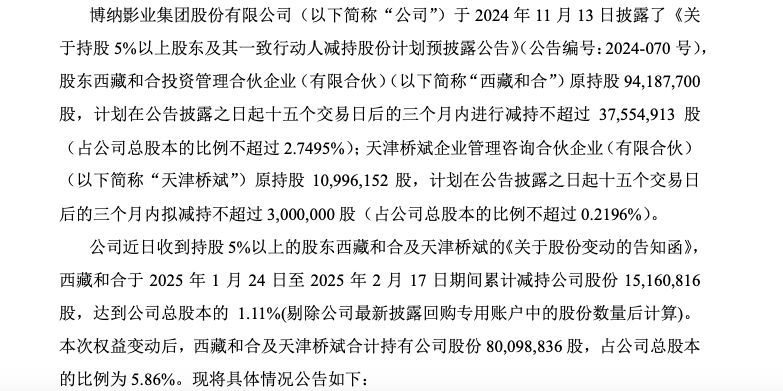 2月18日晚间,博纳影业发布公告,持股5%以上股东西藏和合投资管理合伙企业(以下简称“西藏和合”)及其一致行动人天津桥斌企业管理咨询合伙企业(以下简称“天津桥斌”)于2025年1月24日至2025年2月17日期间累计减持公司股份1516万股,占公司总股本的1.11%。此次减持后,西藏和合及天津桥斌合计持有公司股份8010万股,占公司总股本的比例为5.8643%。
