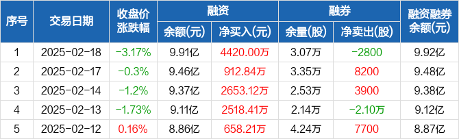 中航光电融资融券信息显示,2025年2月18日融资净买入4420万元;融资余额9.91亿元,创近一年新高,较前一日增加4.67%