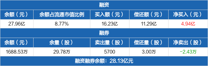 融资方面,当日融资买入16.23亿元,融资偿还11.29亿元,融资净买入4.94亿元,净买入额创历史新高,净买入额两市排名第三,连续8日净买入累计13.79亿元。融券方面,融券卖出5700股,融券偿还3万股,融券余量29.78万股,融券余额1688.53万元。融资融券余额合计28.13亿元。