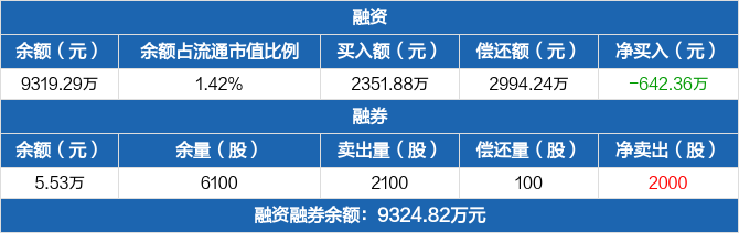 融资方面,当日融资买入2351.88万元,融资偿还2994.24万元,融资净偿还642.36万元。融券方面,融券卖出2100股,融券偿还100股,融券余量6100股,融券余额5.53万元。融资融券余额合计9324.82万元。