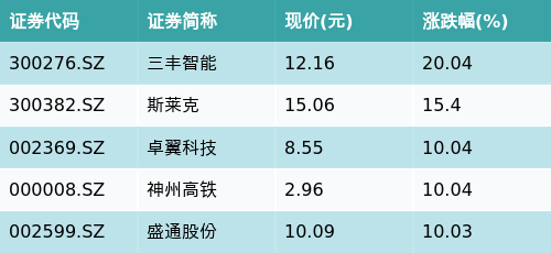 截至午间收盘,机器人概念主题涨跌幅最高的五只股票为:三丰智能(300276.SZ)、斯莱克(300382.SZ)、卓翼科技(002369.SZ)、神州高铁(000008.SZ)与盛通股份(002599.SZ)。详情见下表: