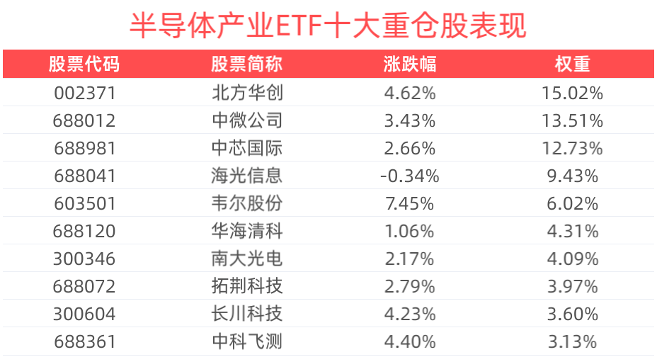 数据显示,截至2025年1月27日,中证半导体产业指数(931865)前十大权重股分别为北方华创(002371)、中微公司(688012)、中芯国际(688981)、海光信息(688041)、韦尔股份(603501)、华海清科(688120)、南大光电(300346)、拓荆科技(688072)、长川科技(300604)、中科飞测(688361),前十大权重股合计占比76.11%。