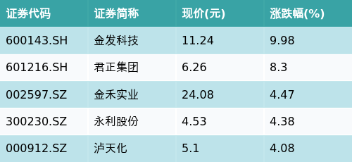 截至收盘,煤化工主题涨跌幅最高的五只股票为:金发科技(600143.SH)、君正集团(601216.SH)、金禾实业(002597.SZ)、永利股份(300230.SZ)与泸天化(000912.SZ)。详情见下表: