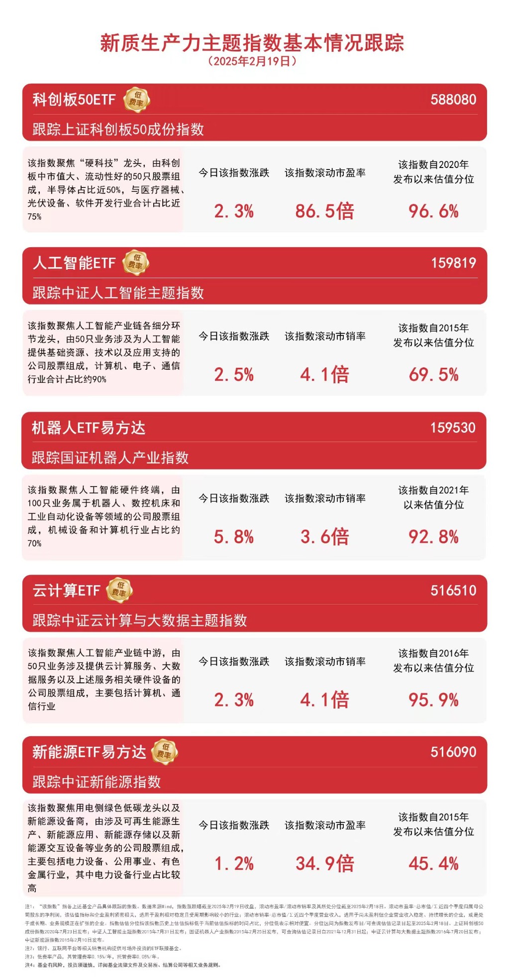今日,人形机器人、半导体、云计算等板块涨幅靠前,新质生产力主题指数集体走高。截至收盘,国证机器人产业指数上涨5.8%,中证人工智能主题指数上涨2.5%,上证科创板50成份指数上涨2.3%,中证云计算与大数据主题指数上涨2.3%,中证新能源指数上涨1.2%。