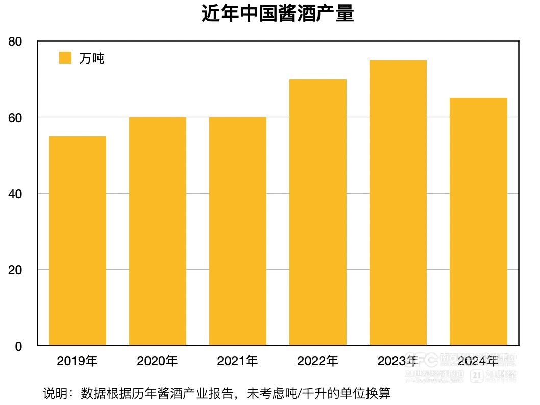21世纪经济报道记者对比近年酱酒产量和白酒全行业产量推算,酱酒的产量占比已经从2019年的7%左右提升至2024年的近16%,占比翻了一倍以上。过去三四年的酱酒产能要在未来几年持续进入市场并且是持续增加的,与白酒行业需求端目前已然下行形成矛盾,要消化这些增长只有两个方向:吸收其他品类白酒的市场空间,或者等待白酒整体需求端恢复增长。