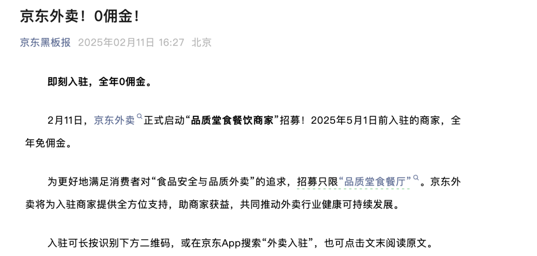 据京东官方微信公众号“京东黑板报”发布的消息,2月11日起,京东外卖启动“品质堂食餐饮商家”招募,并宣布在2025年5月1日前入驻的商家,可享受全年免佣金。