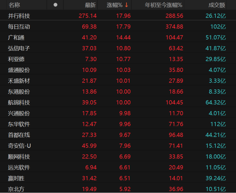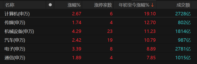 31个申万一级行业中,煤炭、银行等周期股微跌,其他26个飘红,尤其是科技板块涨幅靠前,机械设备板块涨幅超过4%,电子板块以3.39%涨幅紧随其后,计算机、汽车、国防军工、通信、传媒、电力设备板块均表现不错。