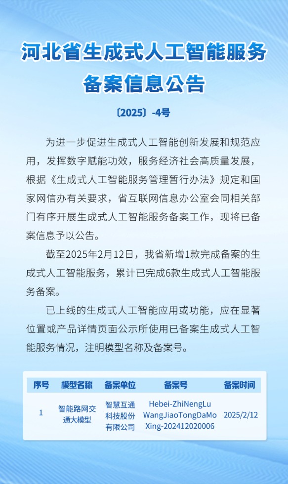 中证报中证网讯(王珞)据智慧互通消息,河北省网信办近日发布的公告显示,智慧互通(AICT)自主研发的“智能路网交通大模型”已成功通过国家网信办的“生成式人工智能服务备案”,正式获得备案批号。这是智慧互通智能路网交通大模型算法获得国家网信办的“境内深度合成服务算法备案”之后的又一里程碑式突破。至此,智能路网交通大模型已实现国家级“双备案”,这也意味着智能路网交通大模型已经达到国家权威机构的认可和肯定,不仅彰显了智慧互通的人工智能技术创新实力,更为人工智能行业的快速发展注入了新势能。
