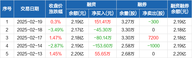 融资方面,当日融资买入522.17万元,融资偿还370.75万元,融资净买入151.41万元。融券方面,融券卖出0股,融券偿还300股,融券余量3.27万股,融券余额10.89万元。融资融券余额合计2.19亿元。