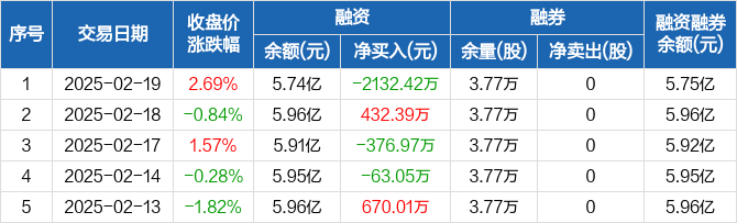 融资方面,当日融资买入2341.42万元,融资偿还4473.84万元,融资净偿还2132.42万元。融券方面,融券卖出0股,融券偿还0股,融券余量3.77万股,融券余额27.33万元。融资融券余额合计5.75亿元。