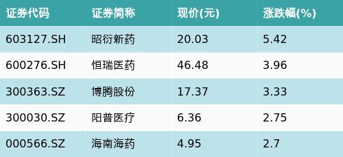 截至午间收盘,细胞免疫治疗主题涨跌幅最高的五只股票为:昭衍新药(603127.SH)、恒瑞医药(600276.SH)、博腾股份(300363.SZ)、阳普医疗(300030.SZ)与海南海药(000566.SZ)。详情见下表: