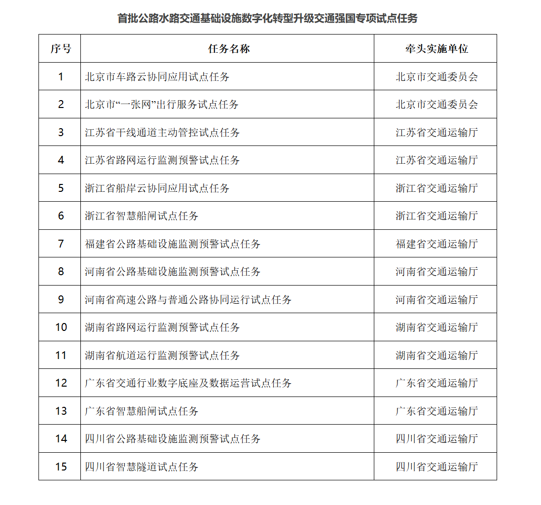 首批公路水路交通基础设施数字化转型升级交通强国专项试点任务名单公布 包括北京市车路云协同应用