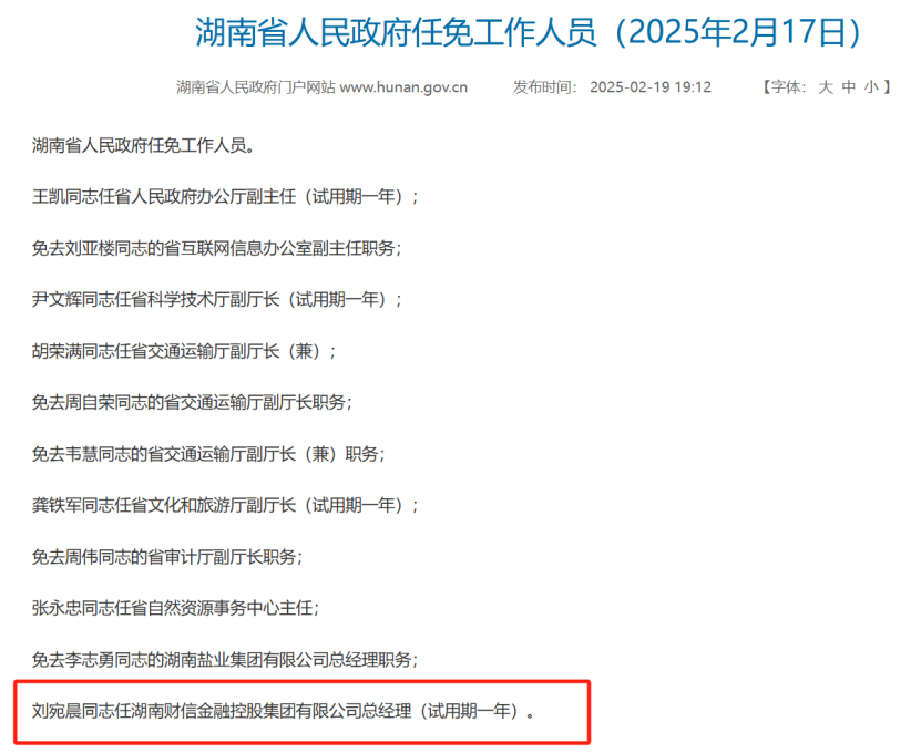 2月19日晚间,湖南省政府官网信息披露,刘宛晨担任湖南财信金融控股集团有限公司(简称“财信金控”)总经理(试用期一年)。