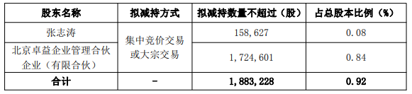 其中,张志涛计划减持公司股份不超过15.86万股,占公司总股本比例0.08%;股东北京卓益则拟“清仓”,计划减持公司股份不超过172.46万股,占公司总股本比例0.84%,为其截至公告日持股数量。