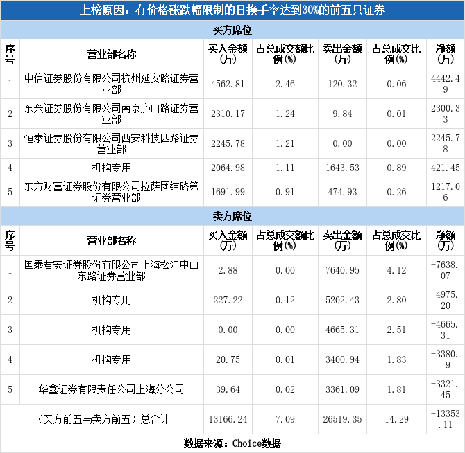 龙虎榜数据显示,今日共4个机构席位出现在龙虎榜单上,分别位列买四、卖二、卖三、卖四,合计净卖出1.26亿元,占龙虎榜净卖额的94.35%。