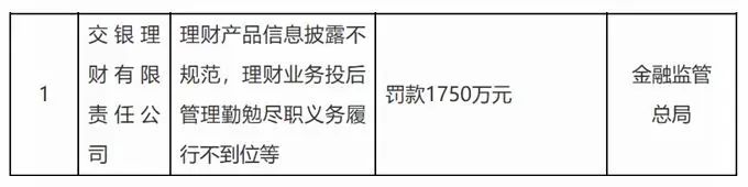 其中,交银理财有限责任公司(以下简称“交银理财”)因理财产品信息披露不规范、理财业务投后管理勤勉尽职义务履行不到位等问题,被处以1750万元罚款。这一处罚金额刷新了银行理财子公司的被罚纪录,引发市场广泛关注,也显示出国家金管局继续加强监管的决心。