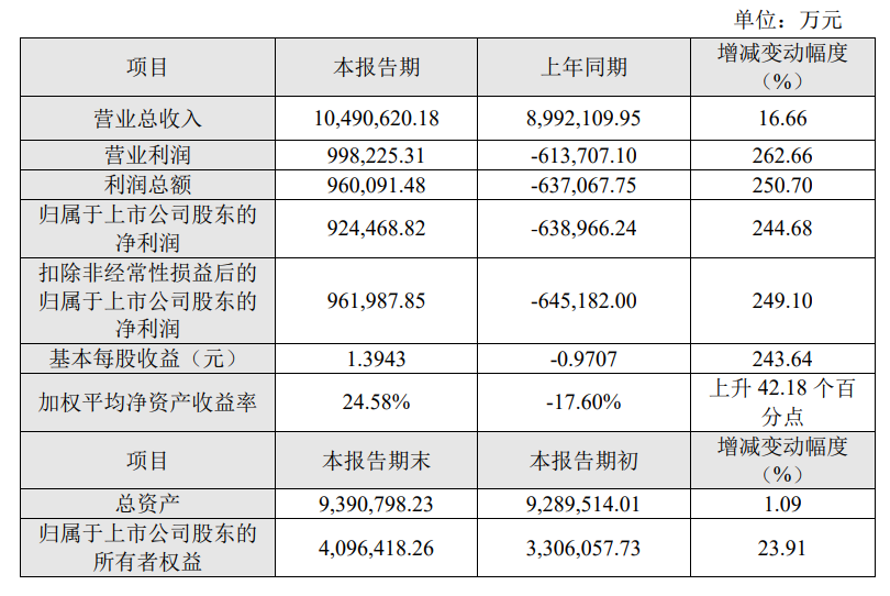 2月20日,温氏股份(300498)发布公告,2024年度业绩快报显示,公司实现营业总收入1049.06亿元,同比增长16.66%。归母净利润为92.45亿元,同比增长244.68%。具体数据如下表: