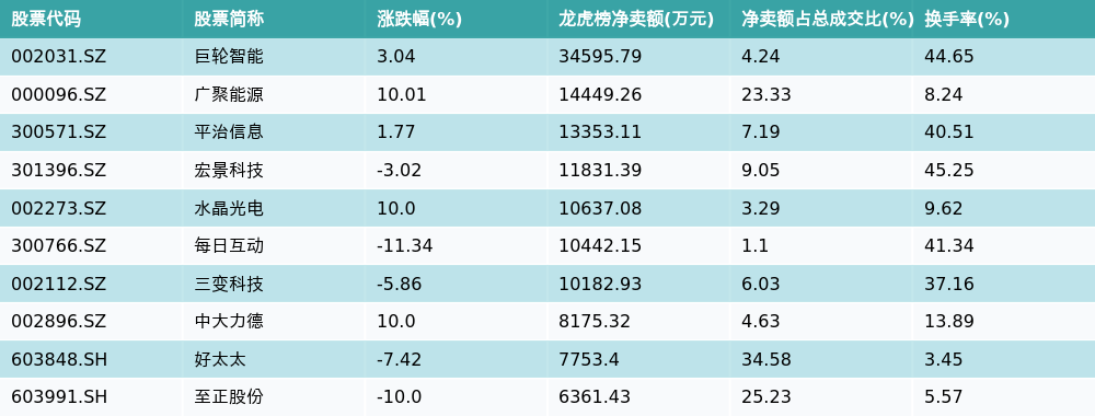 南方财经2月20日电,南财金融终端数据显示,因当日异动登上龙虎榜的个股中,龙虎榜中资金净流出最多的前三位分别是巨轮智能(002031.SZ)、广聚能源(000096.SZ)与平治信息(300571.SZ)。其中排名第一的巨轮智能被净卖出3.46亿元,占总成交金额的4.24%。巨轮智能收盘上涨3.04%,换手率为44.65%。净卖出额前10个股详情见下图: