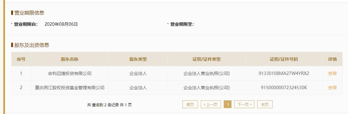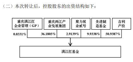 据国家企业信用信息公示系统,满江红企业管理由重庆两江股权投资基金管理有限公司(以下简称两江投资)和吉利迈捷投资分别持股51%和49%。两江投资在股权穿透后由重庆两江新区管理委员会全资控股。