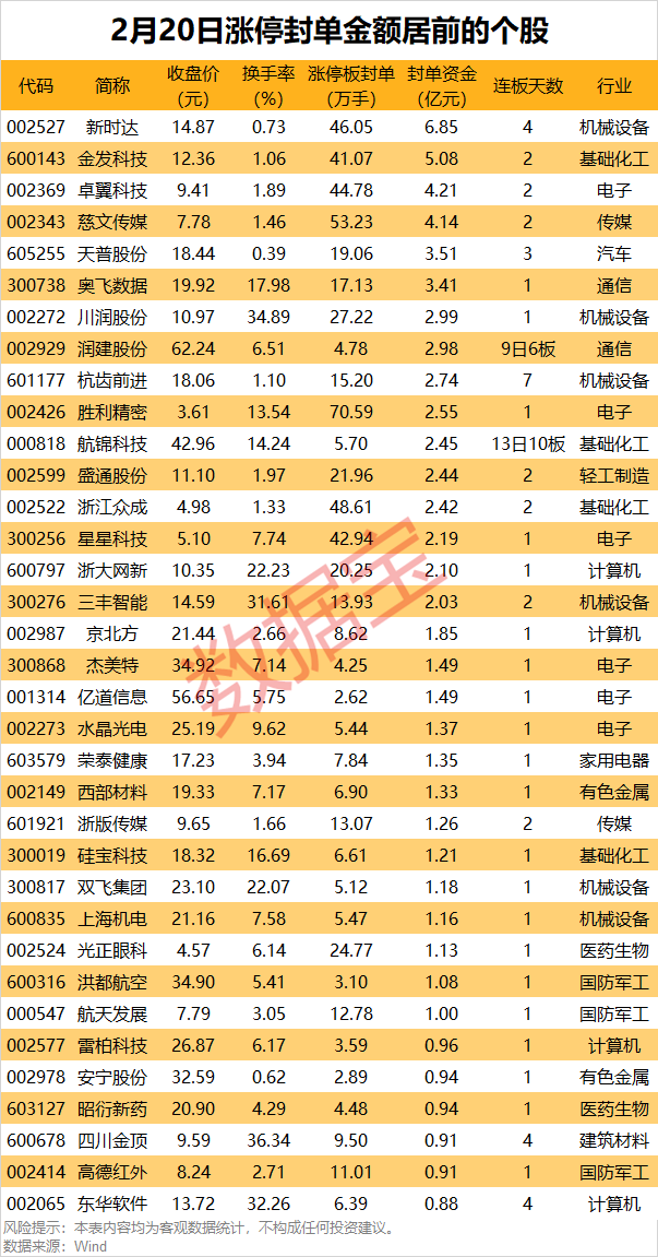 以封单金额计算,29股封单金额超1亿元,新时达、金发科技、卓翼科技封单金额居前,分别为6.85亿元、5.08亿元、4.21亿元。