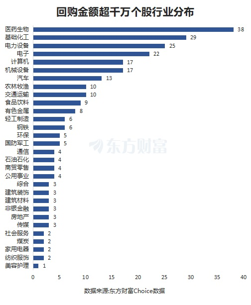 从行业分布来看,今年以来回购金额超千万的263股,分布于医药生物最多,为38股。基础化工紧随其后,为29股。电力设备为25股。电子、计算机、机械设备也分布靠前。