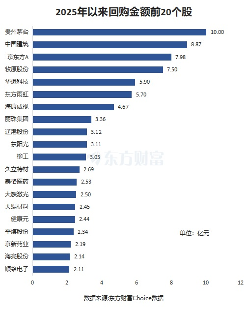 具体而言,贵州茅台为回购金额最高个股,为10亿元。中国建筑紧随其后,回购金额为8.87亿元。京东方A、牧原股份、华懋科技、东方雨虹也回购居前。