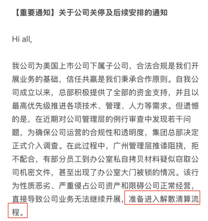 通知中提到,“由于近期对公司管理层的例行审查中发现若干问题,为确保公司运营的合规性和透明度,集团总部决定正式介入调查。在此过程中,广州管理层推诿阻挠,拒不配合,甚至出现了员工私自拷贝材料疑似窃取公司机密文件及办公室大门被锁的情况,直接导致公司业务无法继续开展。因此总部决定广州部门进入解散清算流程。”
