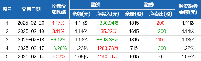 融资方面,当日融资买入1081.64万元,融资偿还1412.57万元,融资净偿还330.94万元。融券方面,融券卖出800股,融券偿还600股,融券余量1815股,融券余额11.74万元。融资融券余额合计1.11亿元。