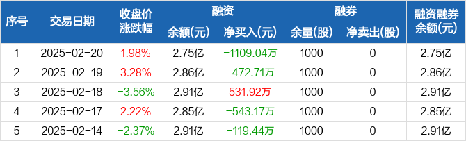 融资方面,当日融资买入1747.69万元,融资偿还2856.73万元,融资净偿还1109.04万元。融券方面,融券卖出0股,融券偿还0股,融券余量1000股,融券余额5140元。融资融券余额合计2.75亿元。