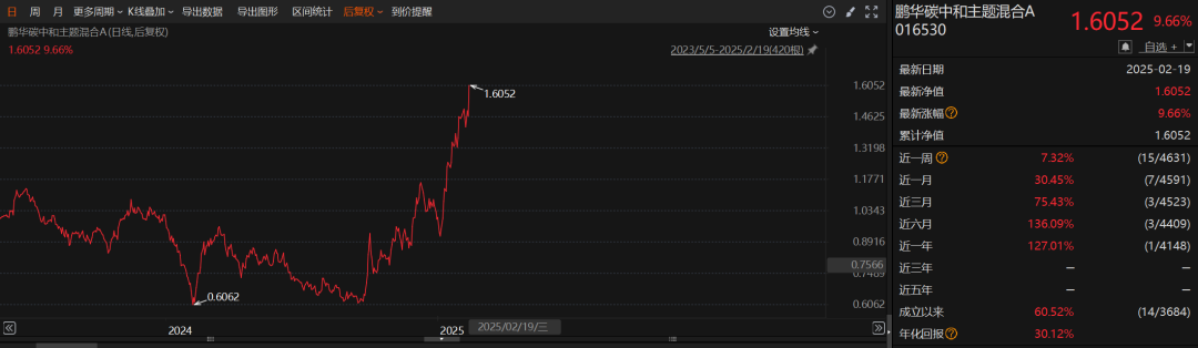 从领涨基金的净值走势看,由于持仓较为极致,净值波动也很剧烈。以鹏华碳中和主题混合为例,2月19日,基金净值单日暴涨9.66%。从该基金成立以来情况来看,鹏华碳中和主题混合成立于2023年5月,去年2月,基金净值一度跌至近0.6元,最新净值则回升至1.61元,创下新高。