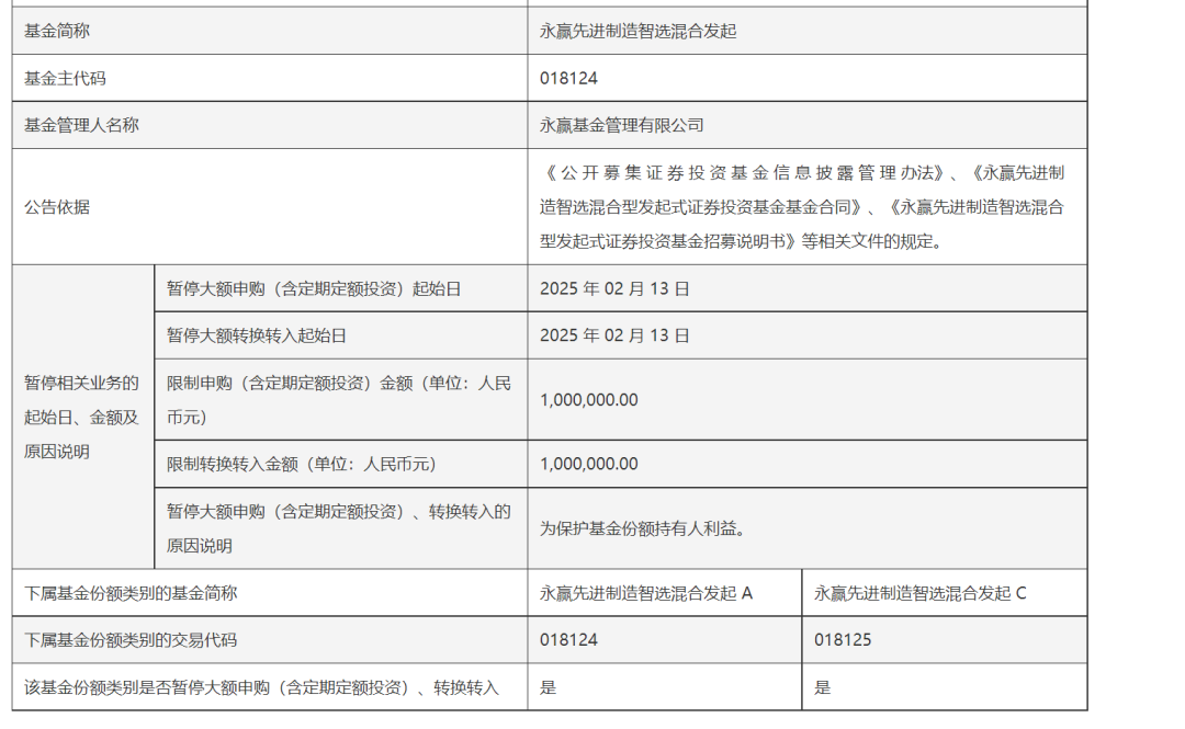 由于资金持续涌入,部分基金发布“限购令”。2月12日,永赢先进制造智选混合公告称,自2月13日起,个人投资者办理基金的申购(含定期定额投资)、转换转入业务,单日单个基金账户单笔申请金额不得高于100万元。