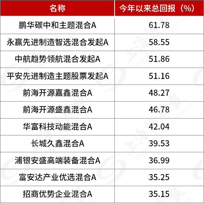 从业绩领先的基金来看,鹏华碳中和主题混合今年以来收益率达到61.78%,永赢先进制造智选混合紧随其后,今年以来收益率为58.55%。此外,中航趋势领航混合、平安先进制造主题股票、前海开源嘉鑫混合、前海开源盛鑫混合今年以来收益率都超过45%。