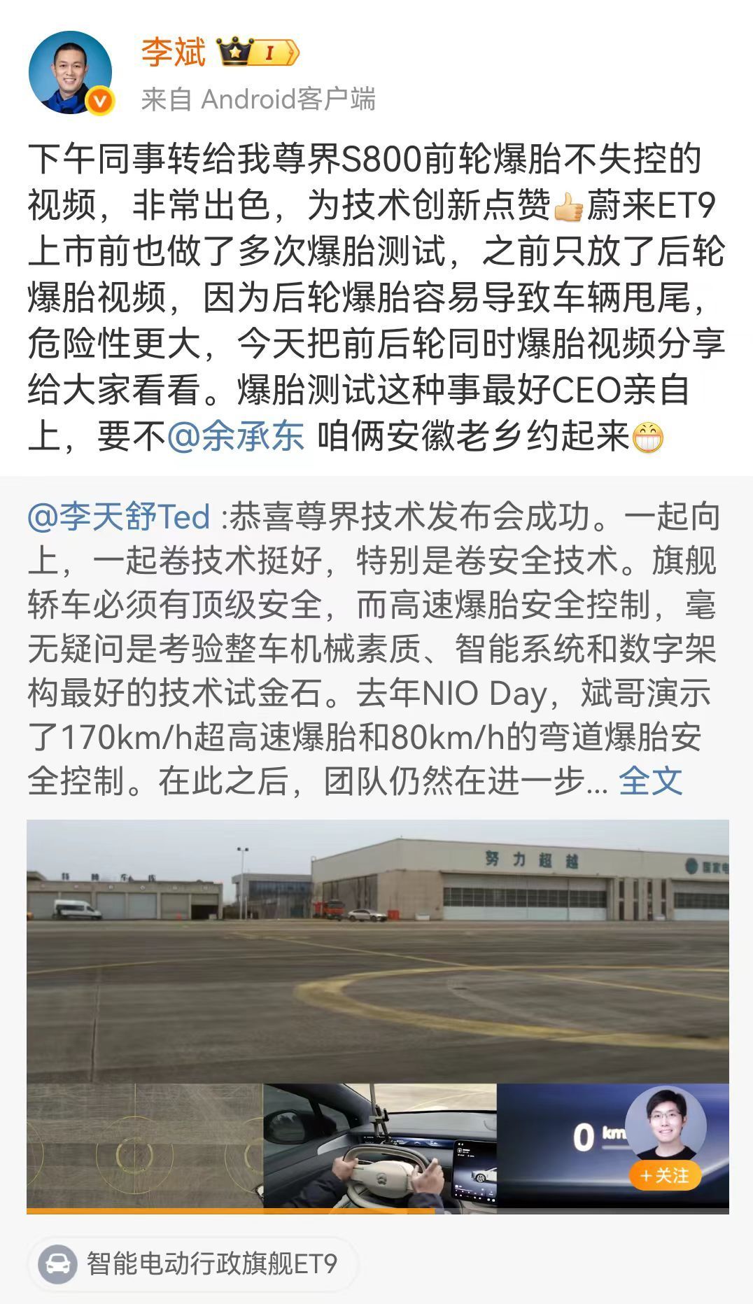 发布会后,蔚来创始人李斌在微博与余承东互动,李斌也隔空邀约余承东一同亲测爆胎,共同提升旗舰轿车安全的技术高度。