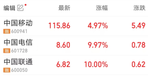 2月21日,A股三大电信运营商持续走高,截至发稿,中国联通、中国电信相继涨停,中国移动涨近5%。其中,中国联通股价创2019年4月以来新高,成交额超94亿元;中国电信股价创历史新高,成交额近30亿元。