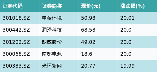 截至午间收盘,数据中心主题涨跌幅最高的五只股票为:申菱环境(301018.SZ)、润泽科技(300442.SZ)、朗威股份(301202.SZ)、南都电源(300068.SZ)与光环新网(300383.SZ)。详情见下表: