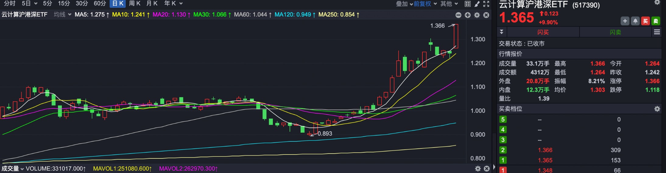 此外,本周五,云计算沪港深ETF冲击涨停板,最终涨幅9.90%。云计算沪港深ETF(517390)紧密跟踪中证沪港深云计算产业指数。相关成分股方面,港股的腾讯和阿里巴巴持仓比例最重。而周五,腾讯控股大涨超过5%;阿里巴巴公布财报之后,今日股价大涨超13%。此外,其重仓股还包括中际旭创、中科曙光、新易盛和金山办公等。