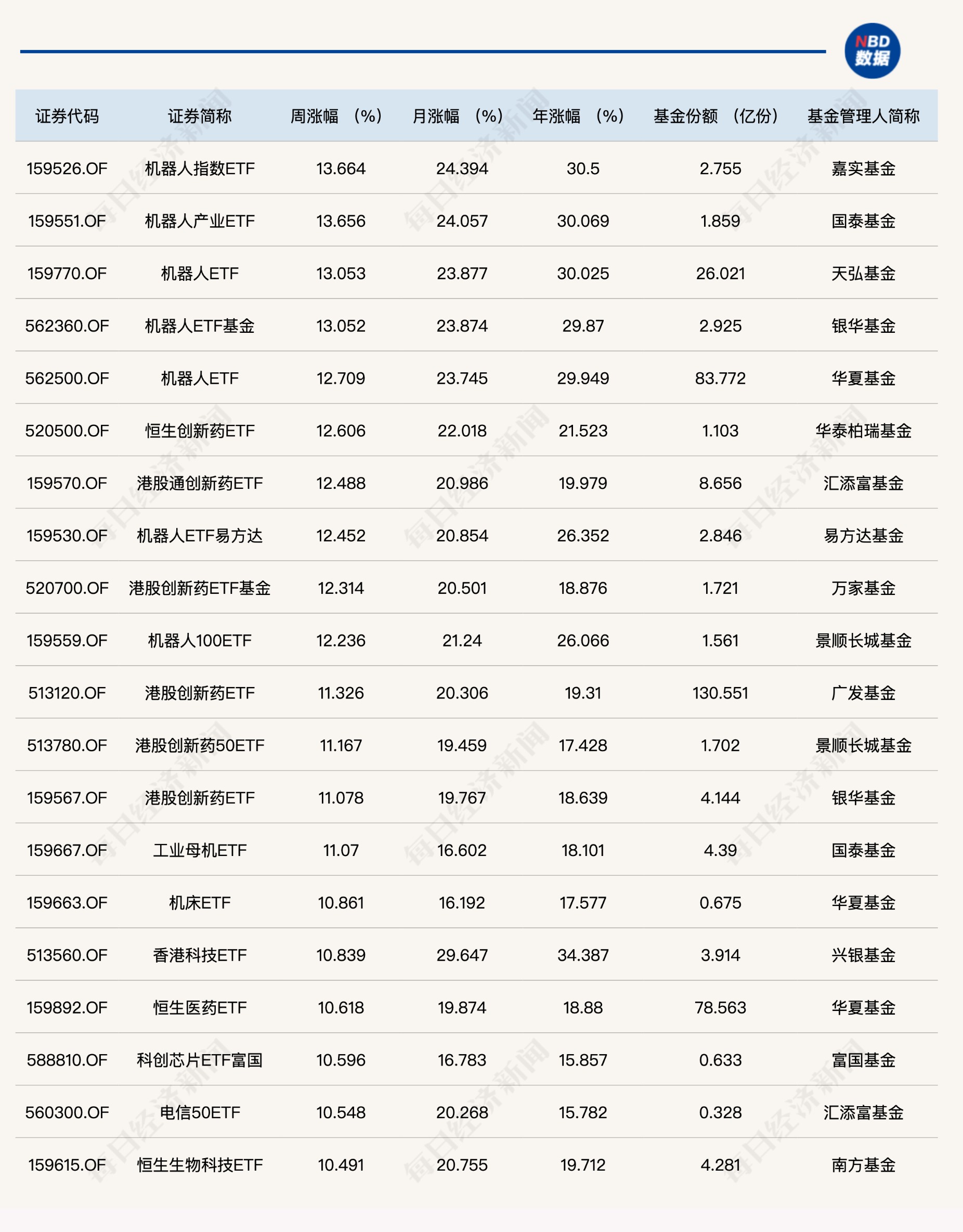 除了机器人相关的ETF外,港股市场布局创新药板块的相关ETF,本周也取得超过10%的收益。