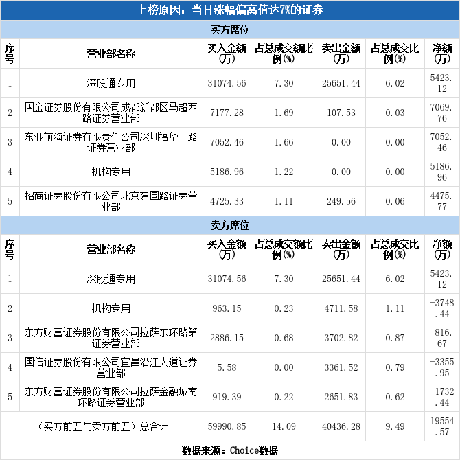 深交所2025年2月21日交易公开信息显示,光迅科技因属于当日涨幅偏离值达7%的证券而登上龙虎榜。光迅科技当日报收57.59元,涨跌幅为10.01%,偏离值达8.44%,换手率9.82%,振幅7.43%,成交额42.59亿元。