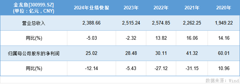 2月20日晚间,金龙鱼发布业绩快报:2024年实现营业收入2388.66亿元,同比下降5.03%;归属于上市公司股东的净利润25.02亿元,同比下降12.14%;扣除非经常性损益的净利润9.72亿元,同比下降26.42%。